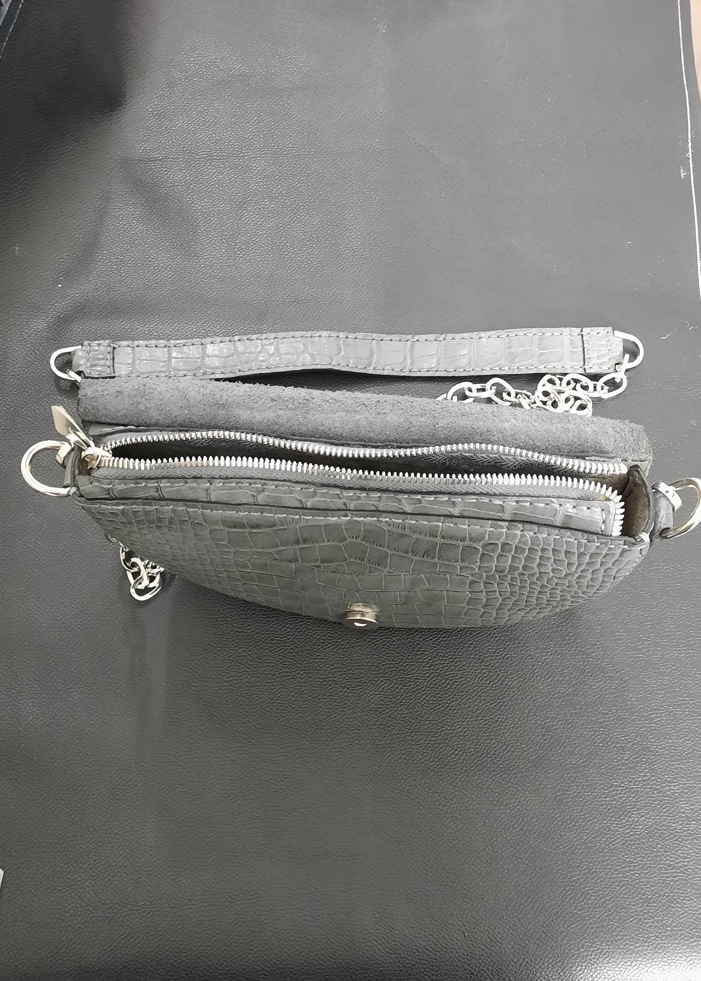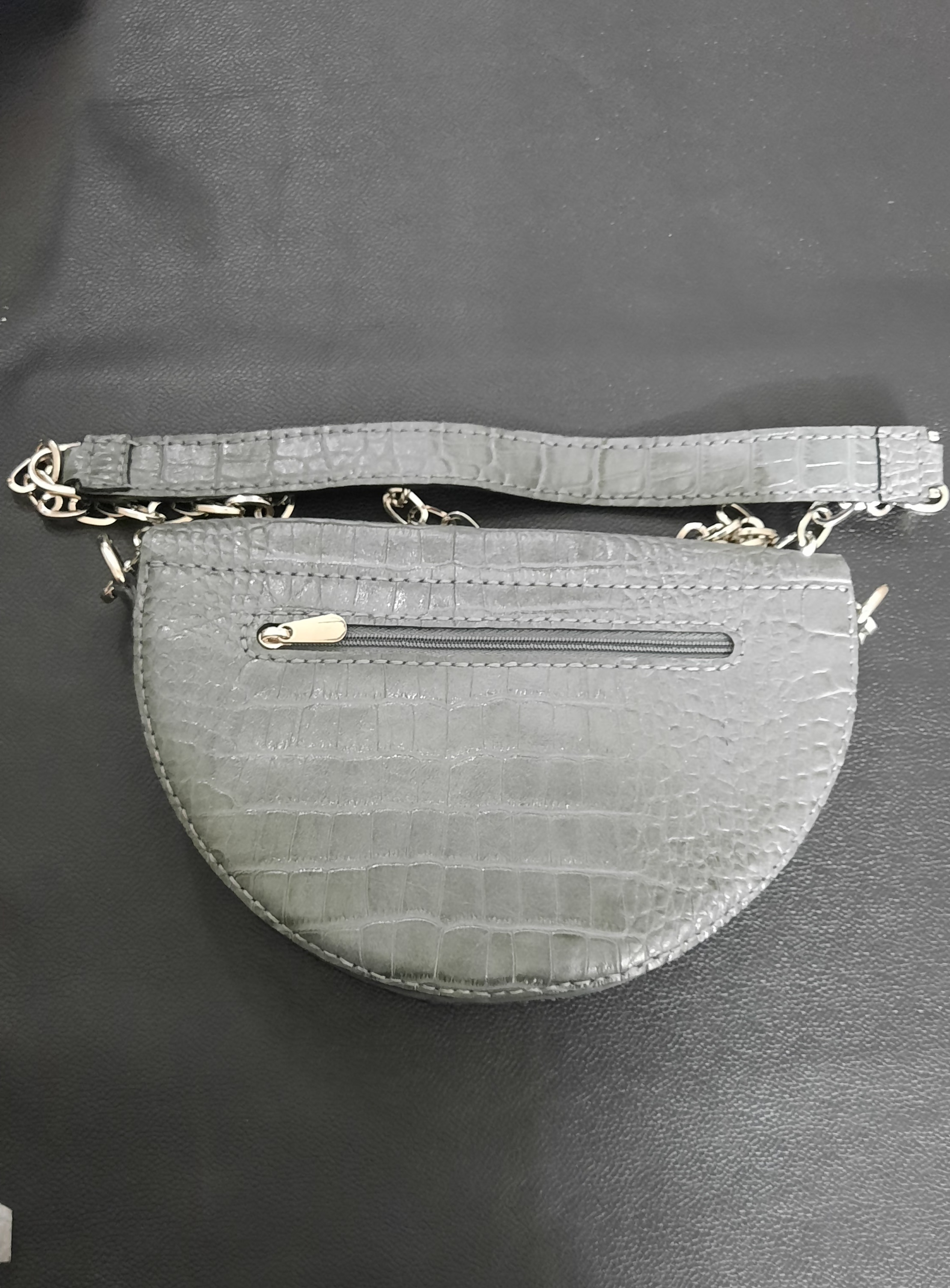 کیف دوشی نیم دایره مدل شکوفه بند زنجیری چرم گاوی طوسی درصورت سفارش جدید قابلیت داشتن بند تمام چرم