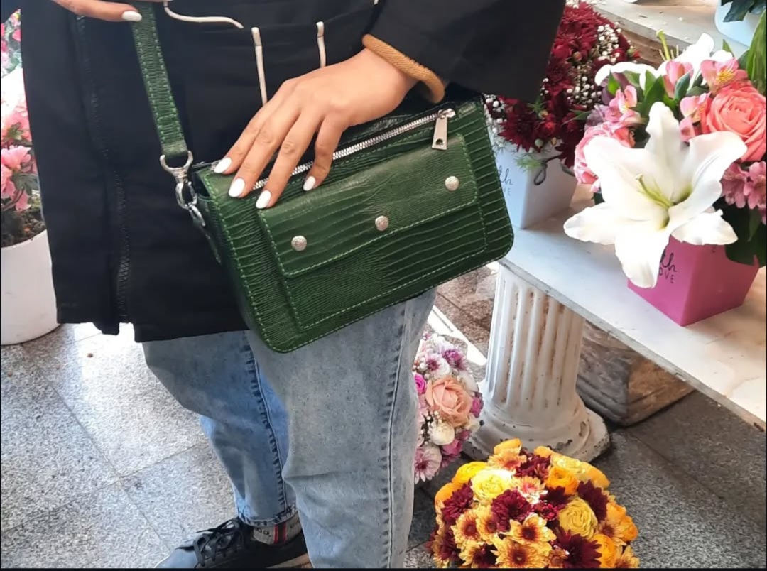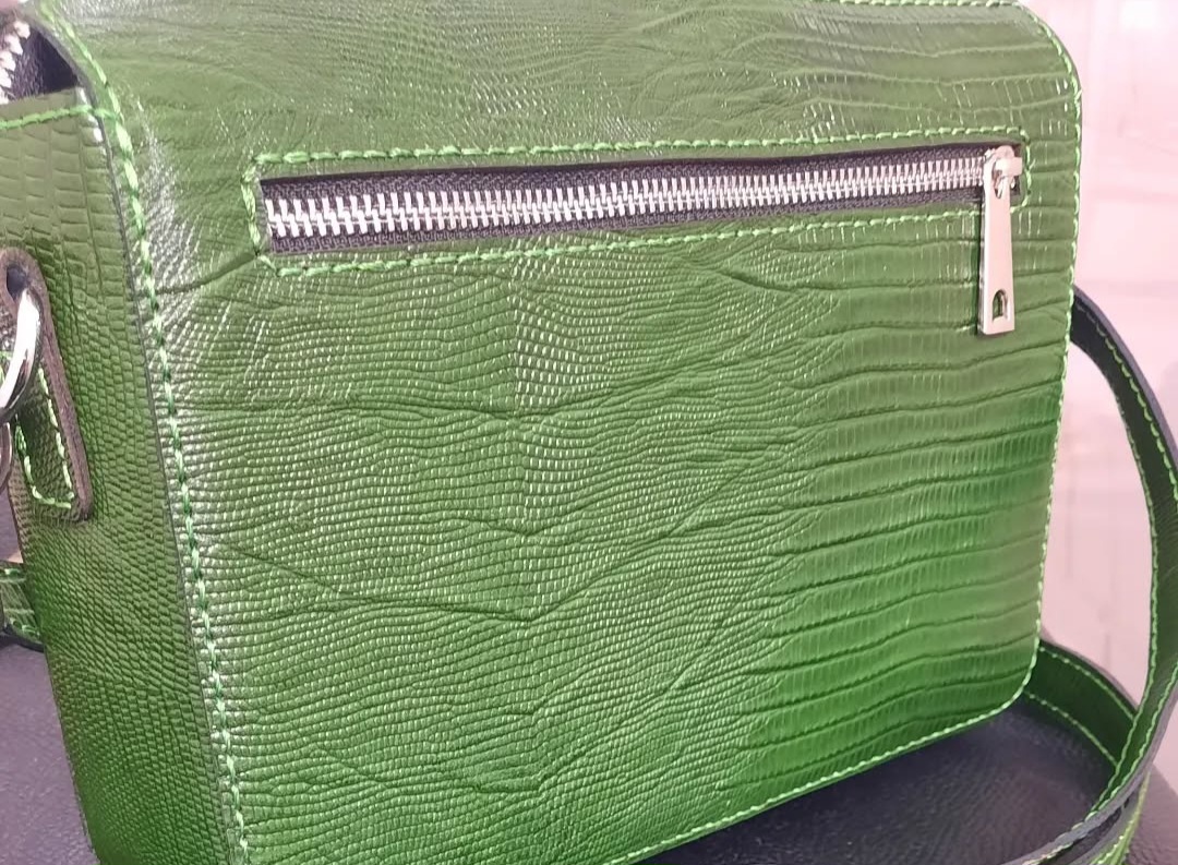 کیف دوشی زنانه مدل F کیف پر کاربرد دوزیپ رخ و پشت کار به اضافه ی جیب بزرگ رخ کار پشت کار و بند تمام چرم کار چرم طبیعی لیزارد سبز